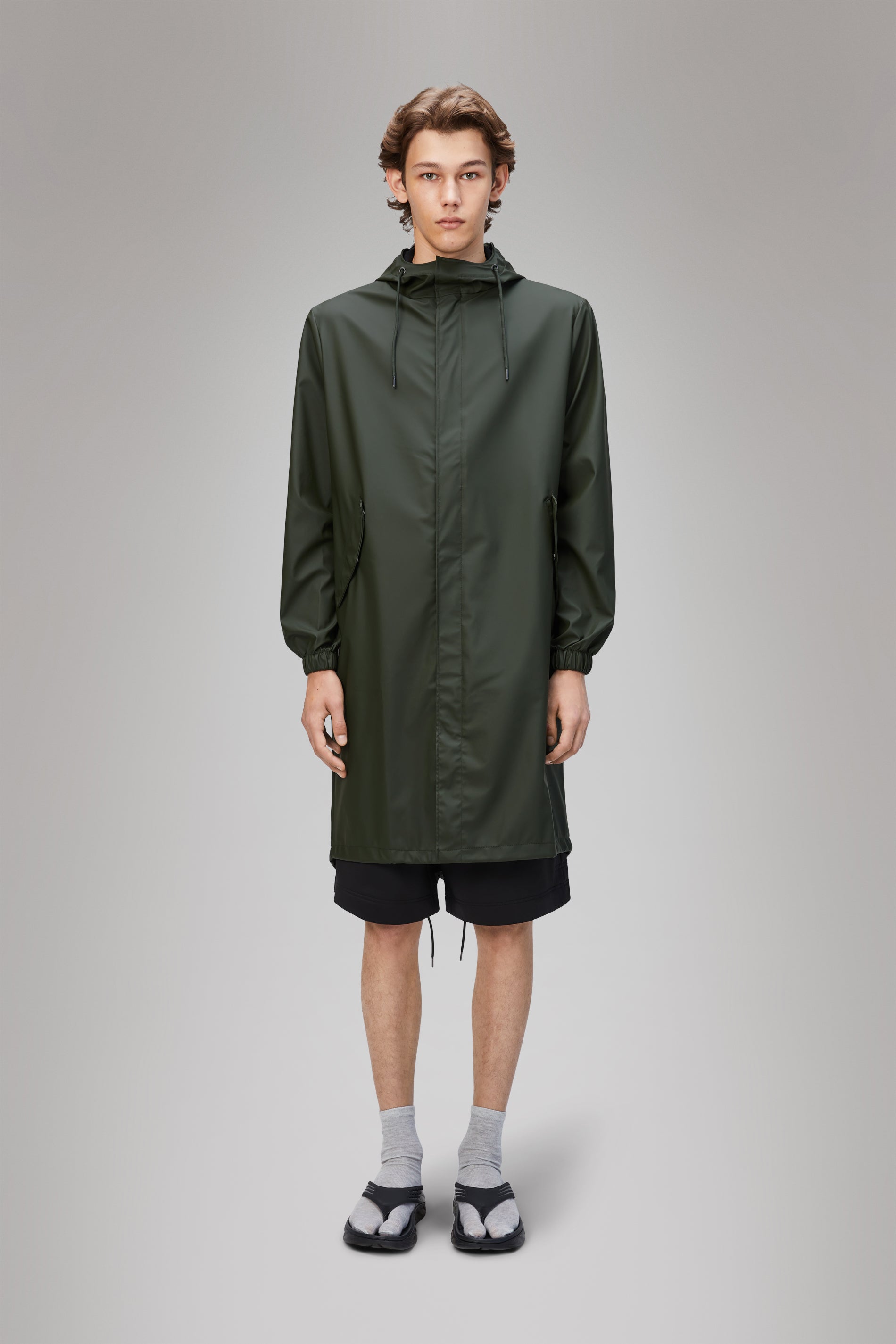 Fishtail Parka es un impermeable unisex. Se caracteriza por su estética minimalista y su bajo en forma de cola de pez con cordón de ajuste y longitud de parka.