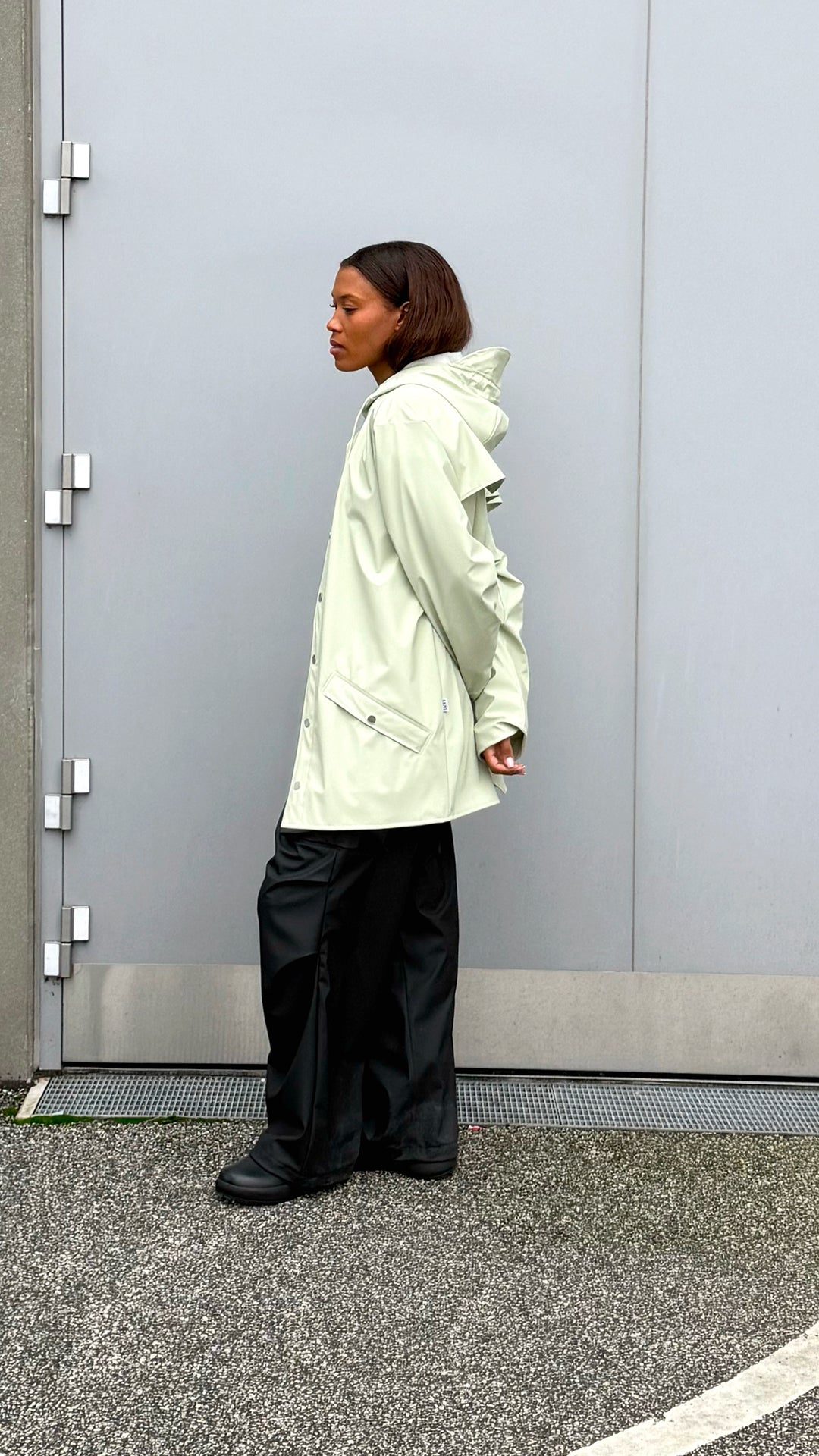 Jacket está confeccionada en el tejido de PU característico de Rains con costuras selladas. Su acabado es ligero y de tacto suave.